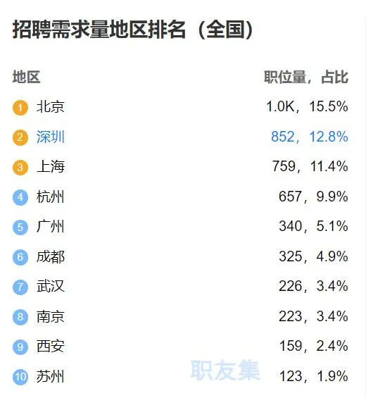 招聘最多的城市還是集中在一線城市,其中北京最高,占比達(dá)到15.5%