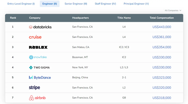 在中級工程師排名中,大數據公司 Databricks 以中位數工資 44.3 萬美元排名第一。2021年,ROBLOX 以中位數工資 33.5 萬美元排名第一,而今年名次有所下滑。