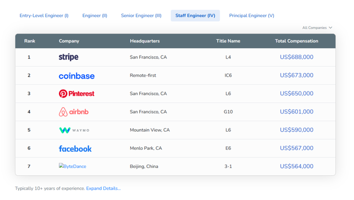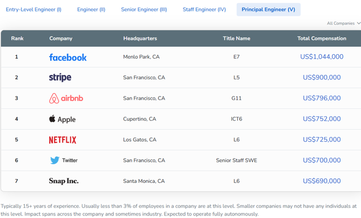 值得一提的是,字節跳動作為唯一上榜的中國公司,雖然在今年的高級工程師榜單上未見其名,但卻在主管工程師排名中顯露了身影,以 56.4 萬美元的薪資取得全球第七位的排名,職級為 3-1 。